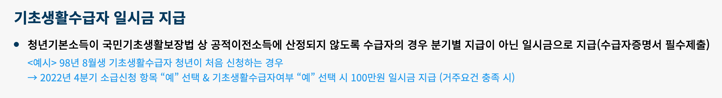 지급 급액은 분기별로 수령하는 것이 원칙이나 기초생활수급자의 경우에는 최대 금액인 100만원을 일시금으로 수령할 수 있습니다. 대신 수급자증명서 제출필수입니다.