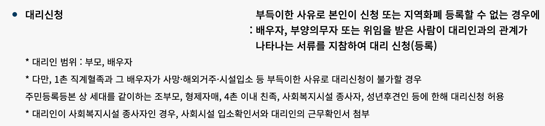 부득이한 경우 본인이 아닌 대리인(부모 혹은 배우자)이 신청할 수도 있습니다. 이 경우의 대리 신청하는 사람이 대리를 맡긴 사람(대리인)과의 관계를 증명할 수 있는 서류를 준비하여 대리 신청해야합니다.