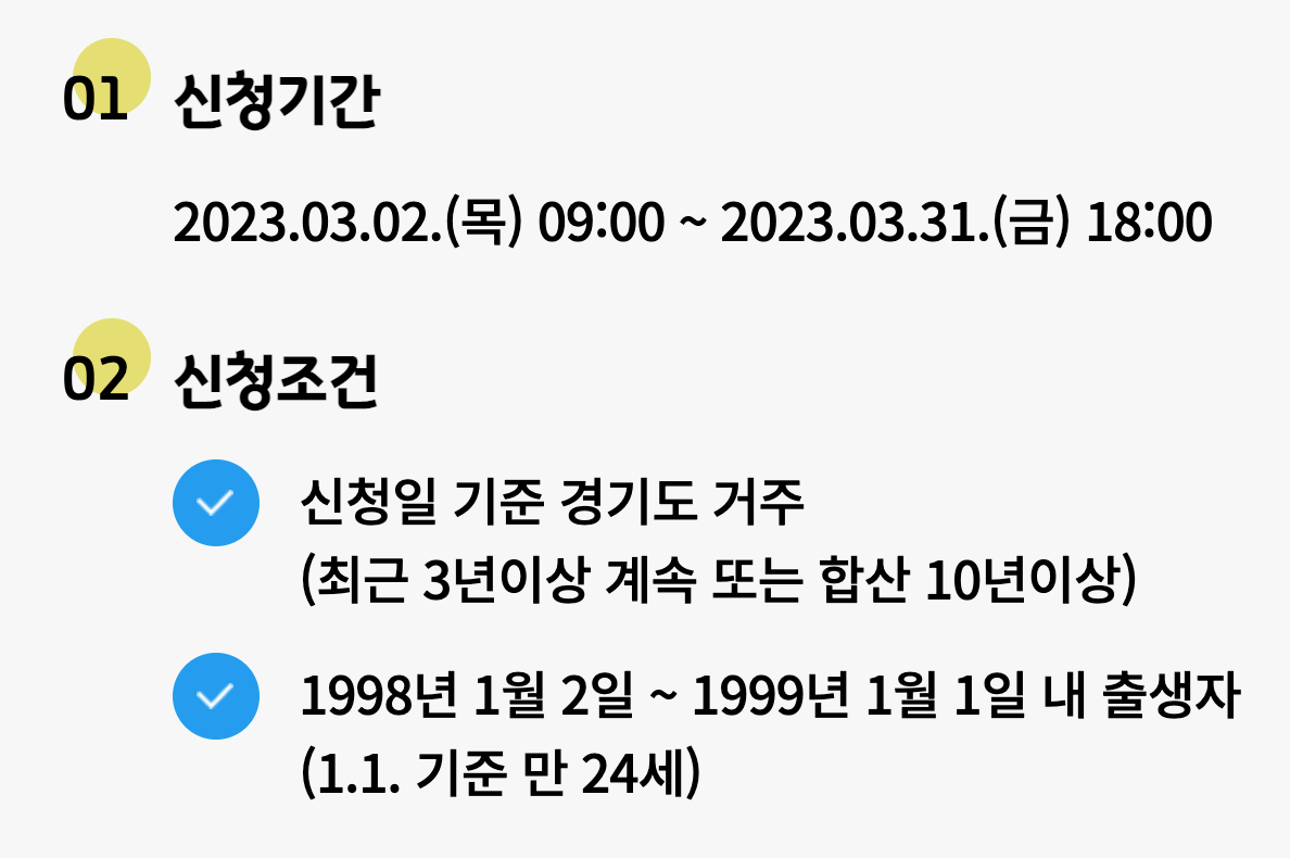 지원 대상은 경기도에 사는 만 24세 청년(1998년 1월 1일~1999년 1월 1일 사이 출생자)으로 경기도에 연속적으로 3년 이상 거주하고 있거나, 경기도 지역에서 산 햇수가 합산 10년이상인 거주자입니다. 지원내용은 분기별 25만원으로 최대 4분기까지 지원합니다.(이때 분기별로 지원 대상자의 생년월일을 확인한다고 합니다. 대상 나이가 넘으면 수급 불가)