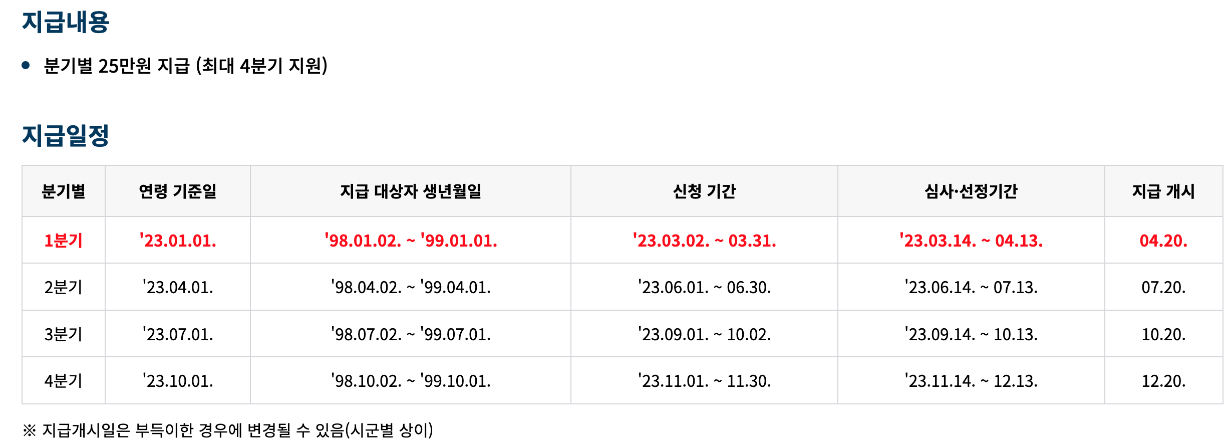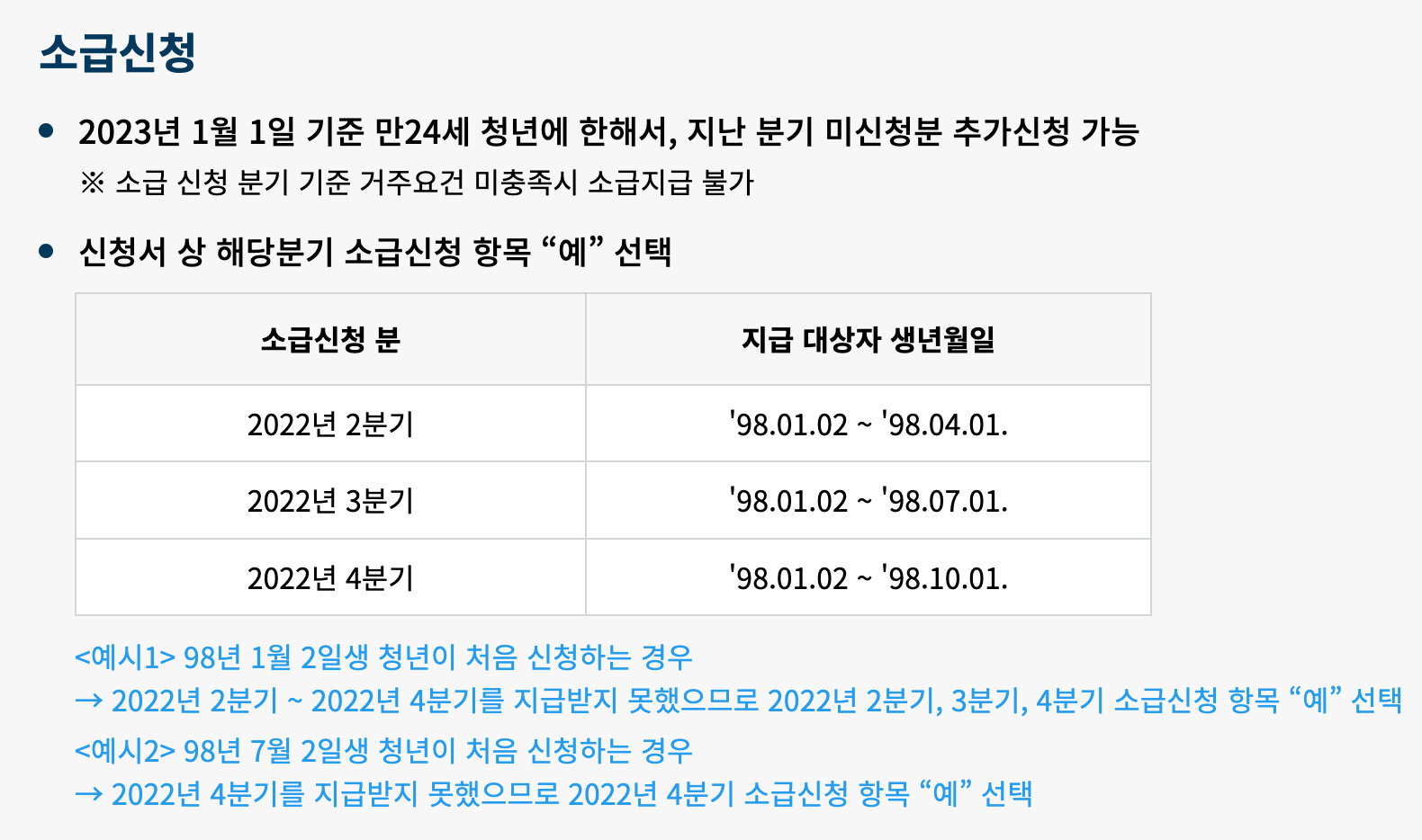 또 23년 1월 1일 기준 만 24세 청년에 한해서, 지난 분기 미신청분을 추가 신청할 수도 있습니다. 이 경우에도 거주 조건은 반드시 충족해야합니다. 소급 신청분과 지급 대상자 생년월일은 아래 그림에서 확인할 수 있습니다.