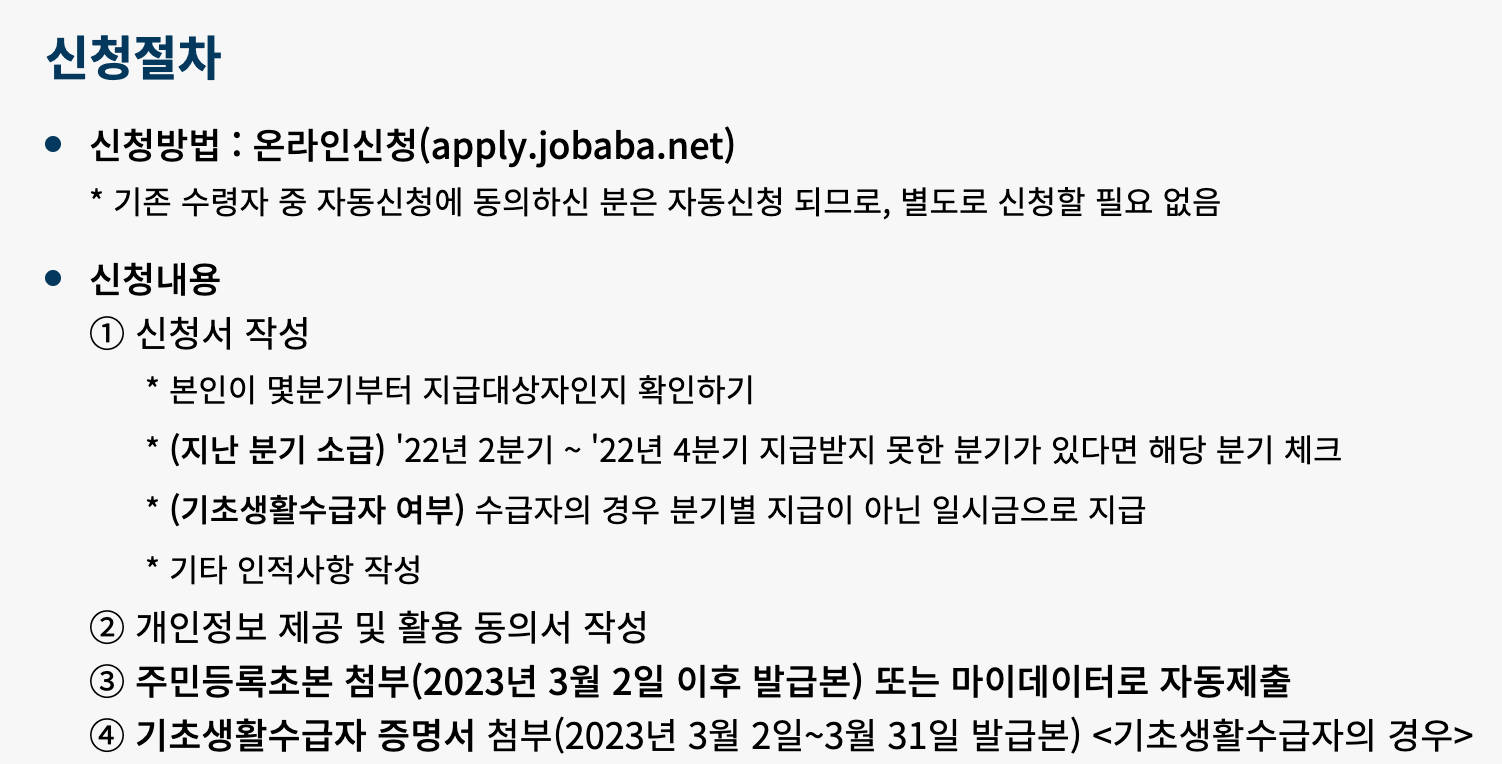 지급 급액은 분기별로 수령하는 것이 원칙이나 기초생활수급자의 경우에는 최대 금액인 100만원을 일시금으로 수령할 수 있습니다. 대신 수급자증명서 제출은 필수입니다.