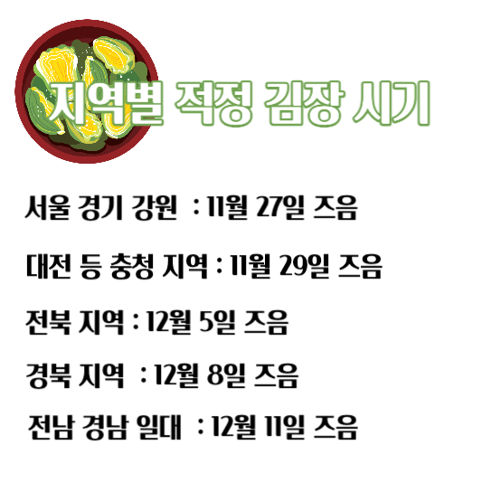 지역별 적정 김장 시기는 기온 예보에 따른 참고 사항이니 참고 하시고 김장 담글 날을 정하시면 좋겠습니다.