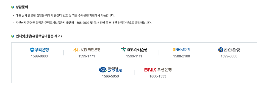 내집마련디딤돌대출을 취급하는 은행은 우리은행, 국민은행, NH, 신한은행, 하나은행, 대구은행, 부산은행 등입니다. 각 은행에 전화로 문의하실 수 있습니다. 전화번호는 아래 이미지에서 확인 가능하십니다.