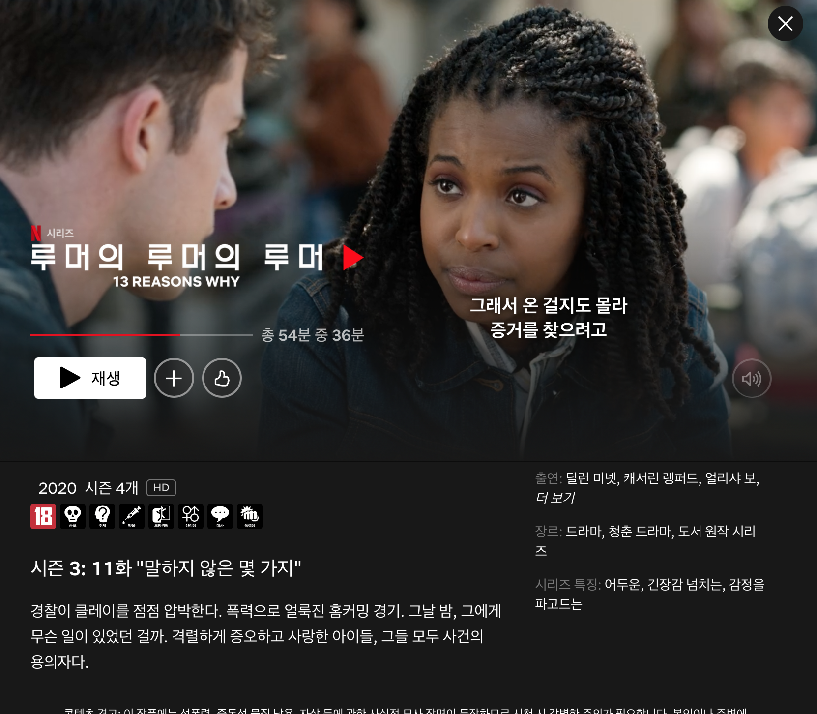 이 이야기는 고등학교를 배경으로 합니다만 꽤나 자극적이고 선정적입니다. 10대의 자살을 다루고 있기에 회차 시작과 끝에는 항상 경고 문구가 나올 정도입니다. 그러나 자극적인 장면만을 위해 이야기를 희생하는 그런 드라마는 아닙니다.
