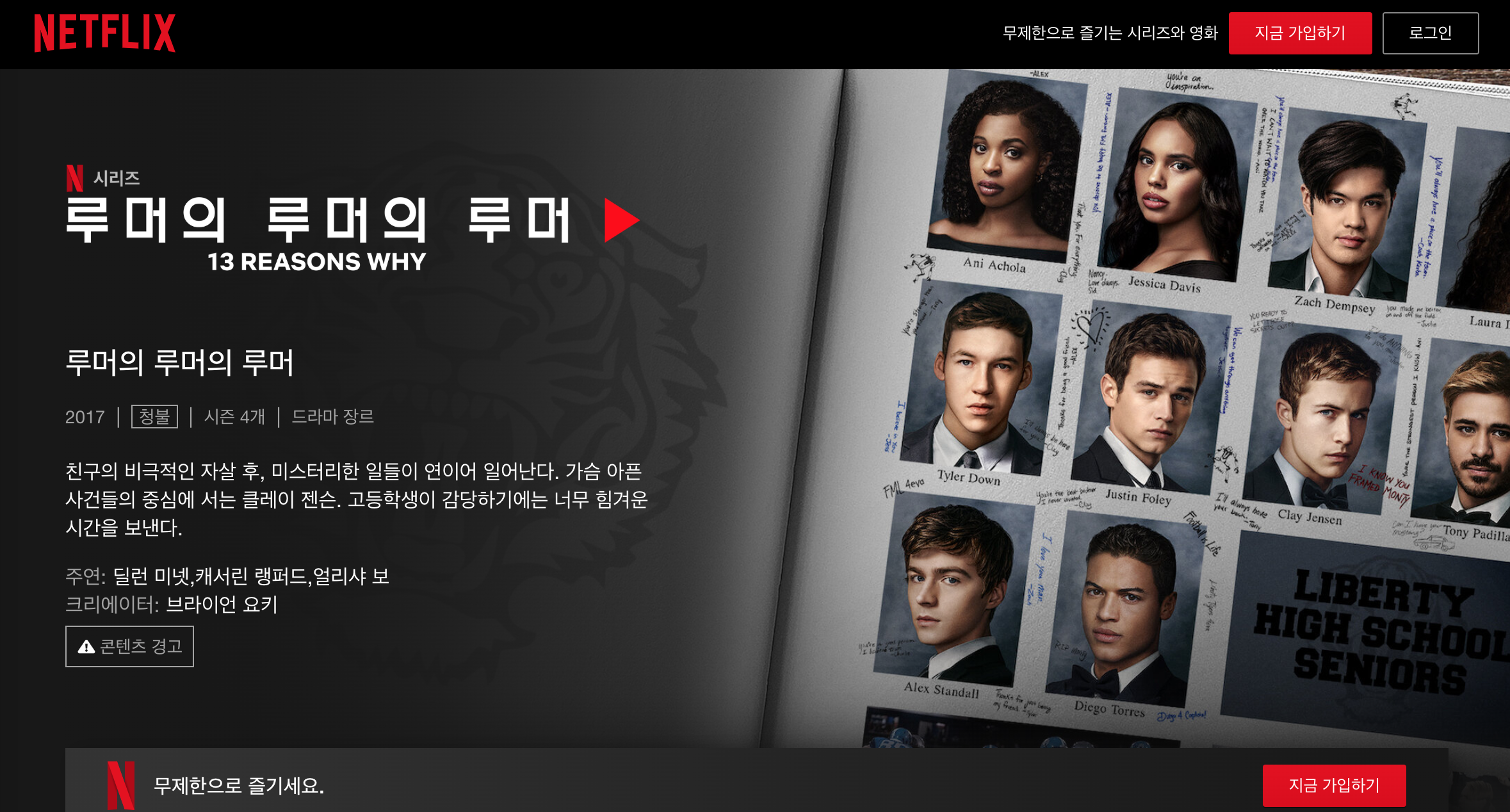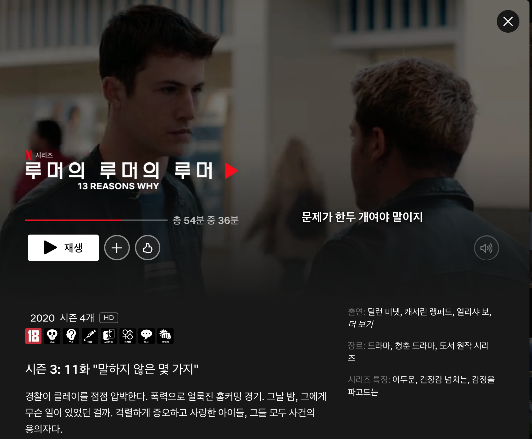 이 이야기는 고등학교를 배경으로 합니다만 꽤나 자극적이고 선정적입니다. 10대의 자살을 다루고 있기에 회차 시작과 끝에는 항상 경고 문구가 나올 정도입니다. 그러나 자극적인 장면만을 위해 이야기를 희생하는 그런 드라마는 아닙니다.