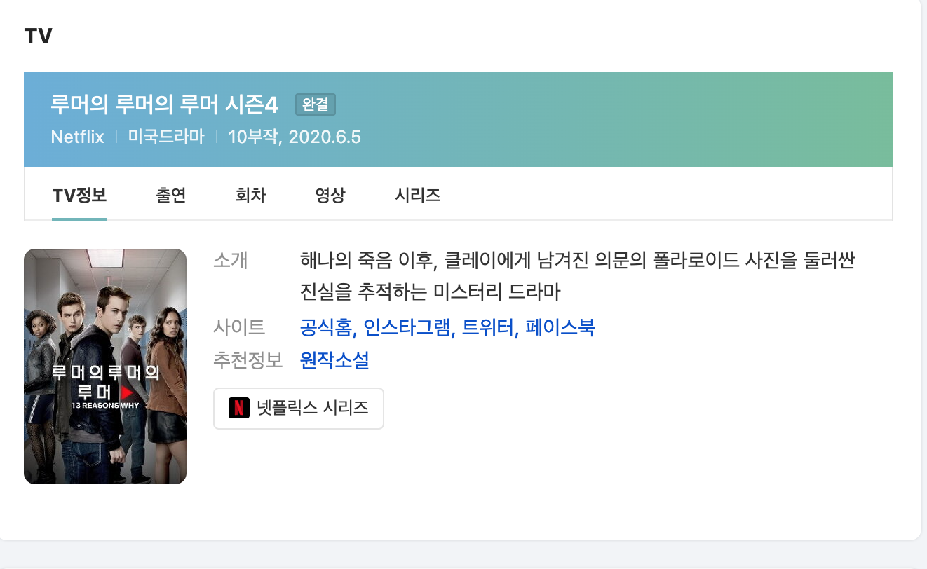 루머의 루머의 루머는 전체 4개의 시즌으로 시즌1~3은 각 시즌별로 13화로 구성되었고 시즌4는 10회로 마무리됩니다. 미스터리한 드라마를 좋아하시는 분들에게는 강력하게 추천드립니다. 특히 시즌1~2까지는 아주 재밌게 보실 수 있을겁니다.