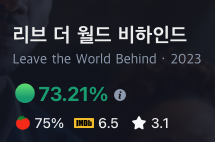 이상 넷플릭스 영화 '리브 더 월드 비하인드' 간단 줄거리, 평점, 결말과 주관적인 해석이었습니다.