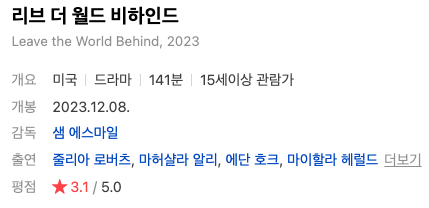 이상 넷플릭스 영화 '리브 더 월드 비하인드' 간단 줄거리, 평점, 결말과 주관적인 해석이었습니다.
