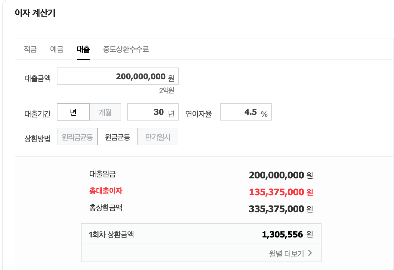 사실 복잡한 계산을 직접할 필요는 없고 은행이나 포털 사이트 대출이자 계산기를 활용하시면 간단하게 확인하실 수 있습니다.