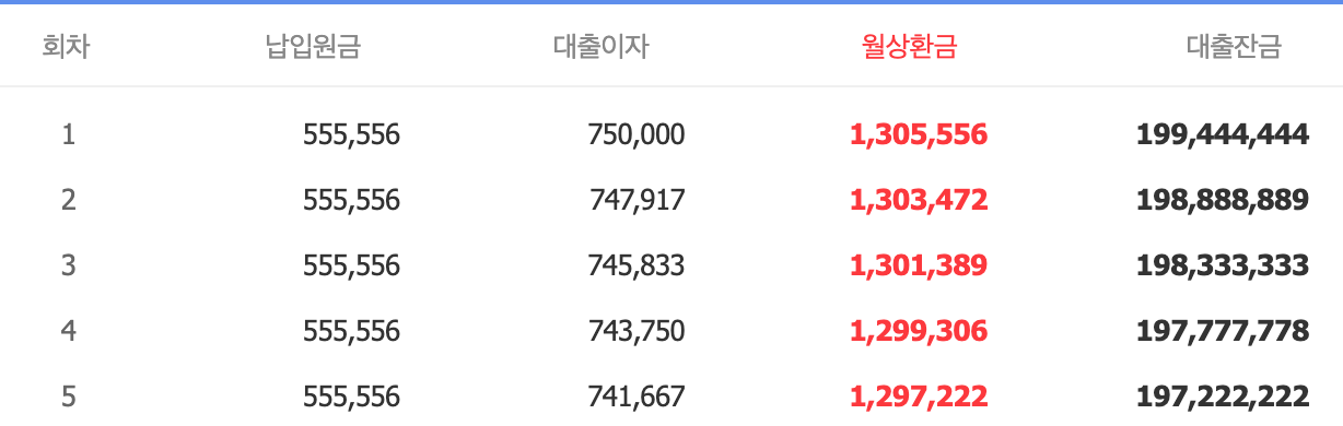 위와 같이 2억을 4.5% 금리로 30년 빌렸을 때 총 이자는 1억 3천 5백 정도로 세 가지 방식 중 가장 적습니다. 대신 1회차 납입 금액이 130만원 정도로 다른 상환보다는 부담이 있습니다.