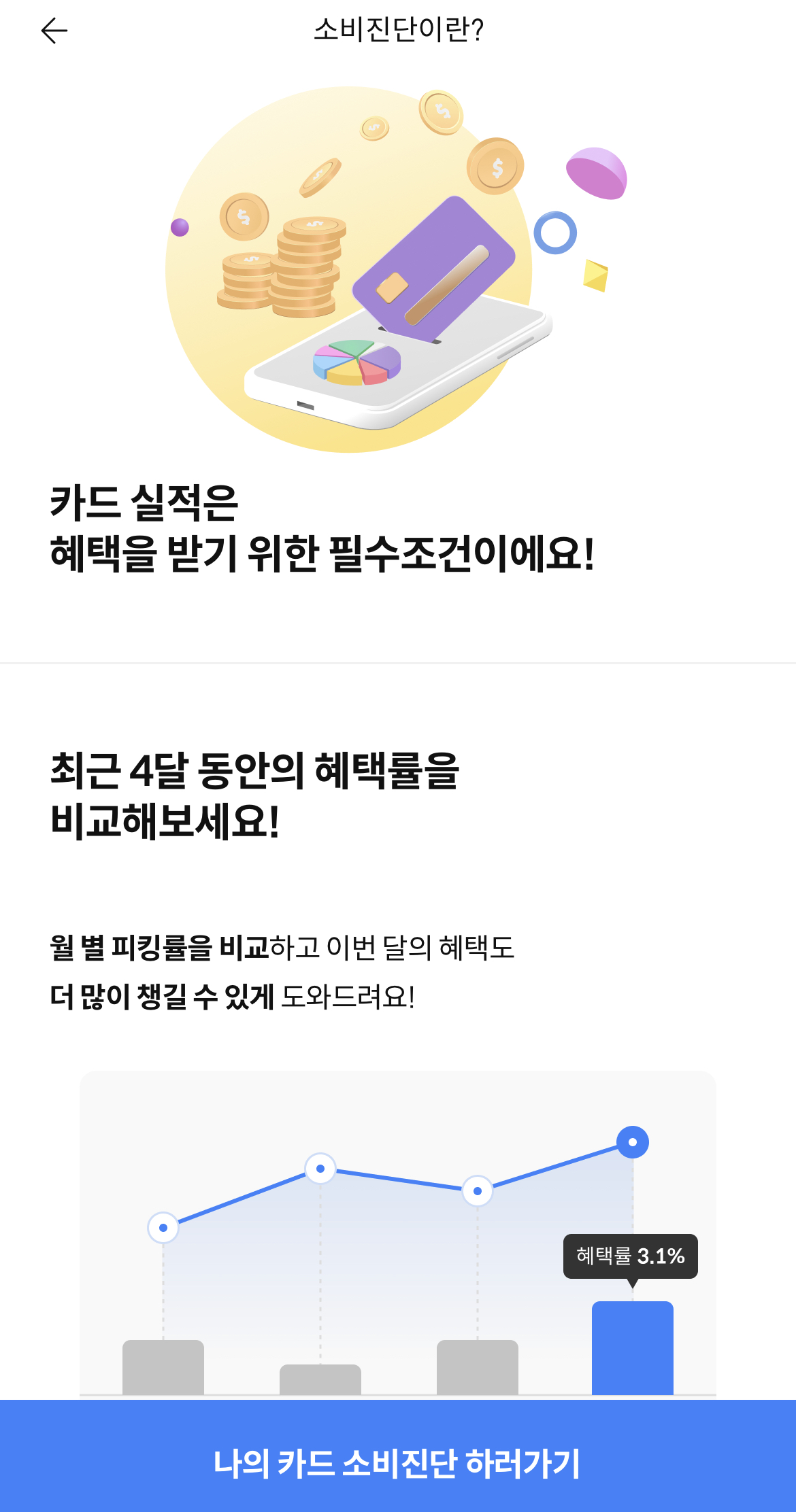 '더쎈카드'의 매력 중에 하나는 '소비진단' 기능입니다. 소비 진단 기능을 이용하면 최근 4개월 카드 사용과 이에 따른 혜택율을 확인할 수 있습니다. 카드 대비 혜택의 비율을 '피킹률'이라고 합니다. 소비 진단에서 '피킹률'이 높을 수록 카드를 '스마트'하게 사용하고 있는 것이라고 하니 여러분들도 본인의 '피킹률' 확인해 보시기 바랍니다.