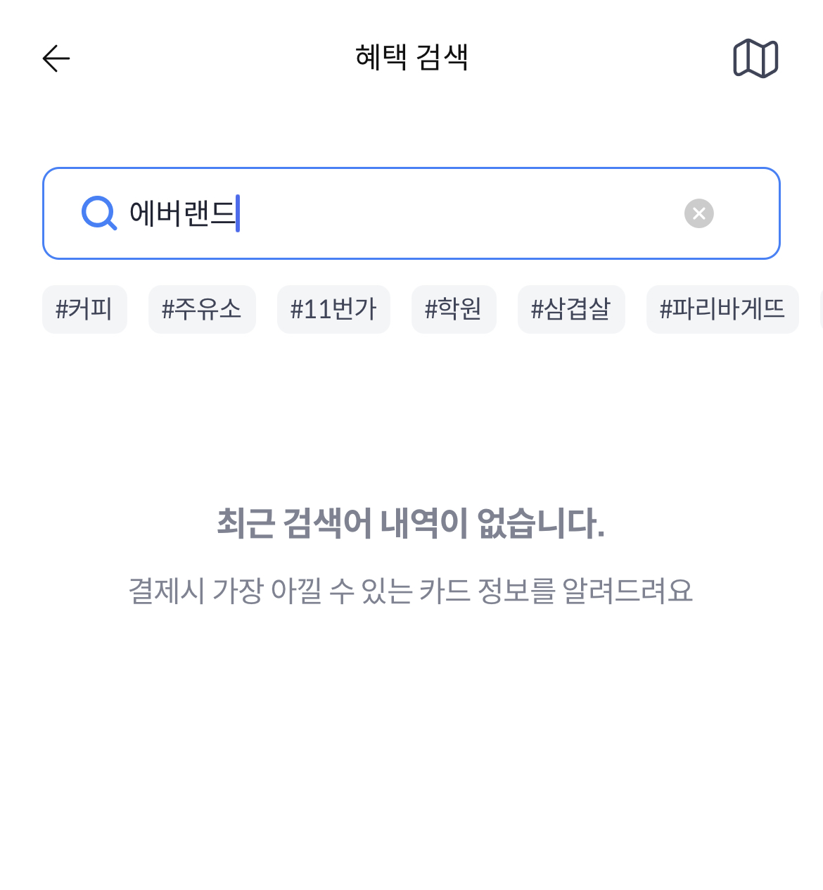 더쎈카드에서 하단의 혜택 찾기를 선택하면 이용하고자 하는 곳에 따른 혜택을 검색할 수 있습니다. 예를 들어 에버랜드에 가기 전 자신이 보유한 카드 중 어떤 카드를 써야 더 유리한지 궁금하신 경우 더쎈카드 앱에서 혜택찾기를 선택하여 상단 검색창에 에버랜드를 검색해 봅니다.
