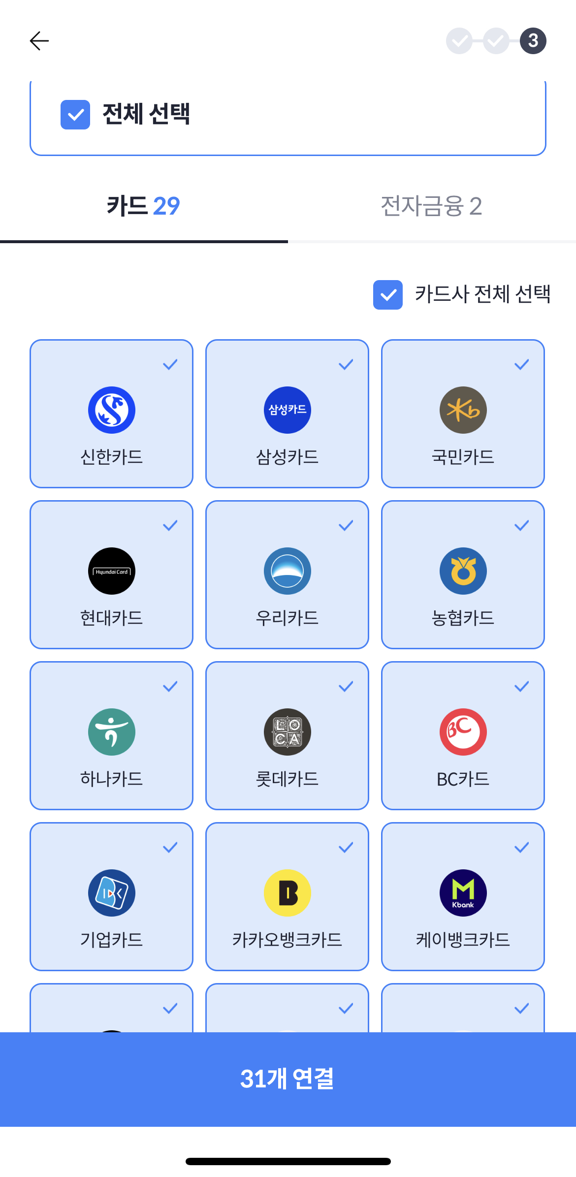 첫 화면에는 모든 카드가 선택된 상태이므로 본인이 사용하지 않는 카드를 터치하여 제외해주면 됩니다.