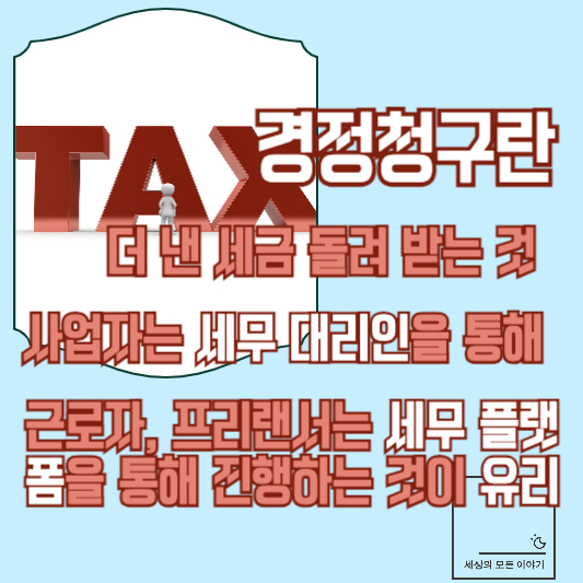 세금 국민이라면 당연히 내야합니다. 그러나 합법적으로 세금을 아끼거나(절세) 그런데 합법적으로 더 낸 세금 돌려 받을 방법(환급)이 있다면 알아 두는 것이 좋을 것입니다. 이번 포스팅에서는 혹시나 더 낸 세금이 있을 경우 환급 받을 수 있는 방법, '경정청구'에 대해 알려 드리겠습니다. 간단하게 확인하시고 도움 받으시기 바랍니다.