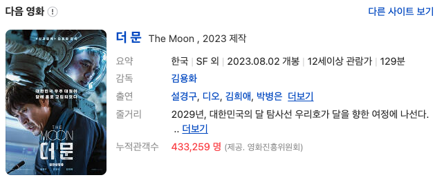 8월 2일 개봉한 '더 문'은 총 제작비 약 280억 원을 들인 대작입니다. 약 600만 명 정도 관객이 들어와야 '손익분기점'을 넘길 수 있다고 합니다. 8월 11일 기준 국내 관객 수는 44만 5천 명으로 많이 부진합니다. 그리고 일부 기사를 보면 관객 점유율이나 예매율이 개봉주보다 점점 떨어지고 있다고 하니 전망이 어둡습니다.