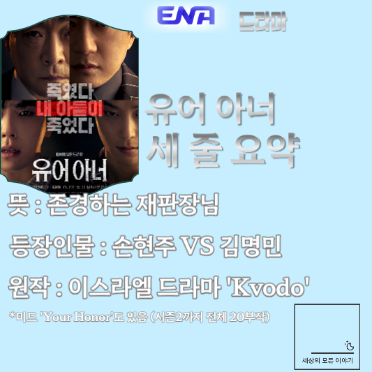 2024년 8월 12일 첫 방송된 ENA 월화 드라마 '유어 아너' 아시나요? '유어 아너'는 손현주, 김명민 캐스팅부터 화려한 드라마로 시작부터 시청자들의 이목을 끌고 있습니다. 이번 포스팅에서는 드라마 '유어 아너'의 뜻과 등장인물, 원작 정보 및 재방 시간에 대해서 알려 드리겠습니다.