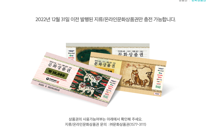 문화상품권은 (주) 문화상품권에서 발행하는 상품권으로 5천원권 만원권 오만원권의 세 종류가 발행중입니다.