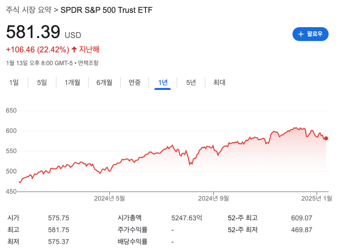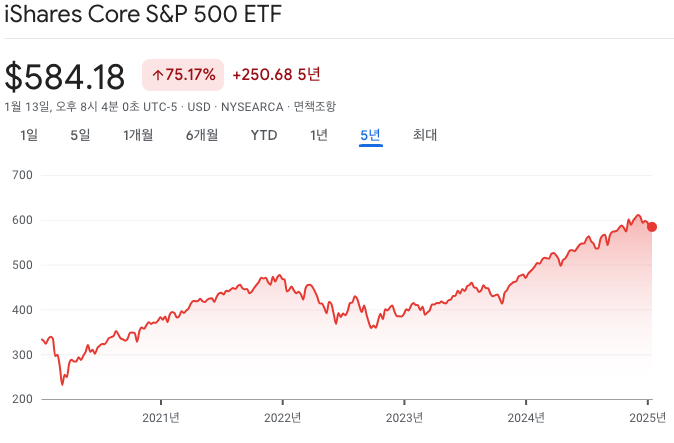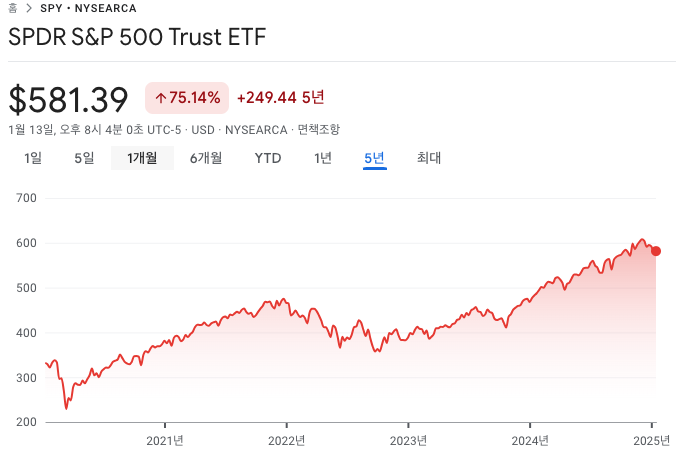 24년 1월 기준 S&P 500에 속하는 기업의 시가 총액이 전체 상장 기업(약 8000여개)의 80%를 차지 한다고 합니다. S&P500은 지난 몇 년 간 꾸준히 상승하였는데요 지난 1년 동안 22.46% 상승했고 기준을 최근 5년으로 넓히면 75.28% 상승했습니다.