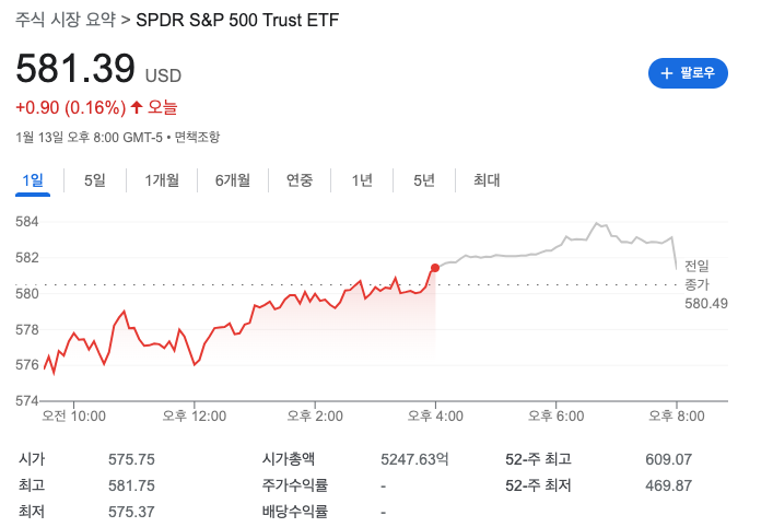 우선 SPY가 있습니다. 스테이트 스트리트사에서 운용하는 ETF로 현재 1주당 581.39$로 꽤나 가격이 높게 형성되어 있습니다. 그만큼 오랜 시간 꾸준하게 수익을 올렸다고 할 수 있겠습니다. 지난 1년 22.42% 상승 최근 5년 75.14% 상승률을 보이고 있습니다.