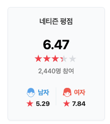 영화 '발레리나'는 공개된 이후 현재까지 넷플릭스에서 오늘의 영화 순위 1위를 달리고 있고 전체 콘텐츠에서도 2위에 위치하고 있습니다. 우리나라 외에 다른 나라에서도 탑10 안에 드는 등 반응은 좋은 편입니다. 네이버나 다음의 평점은 각각 6.47과 6.5로 비슷합니다. 남자보다 여성 관객들이 더 높이 평가하는 점이 흥미롭습니다.