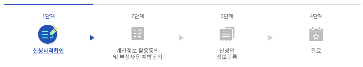 온라인으로 접속하면 총 3단계를 거쳐 신청 접수를 하게 됩니다. 1단계에서는 연령 및 소득, 거주 지역 등 신청 자격을 확인하고 2단계에서는 개인 정보 활용 동의 및 부정 사용 예방 동의를 한 후, 3단계에서 신청인 정보를 등록하면 접수가 마무리 완료됩니다.