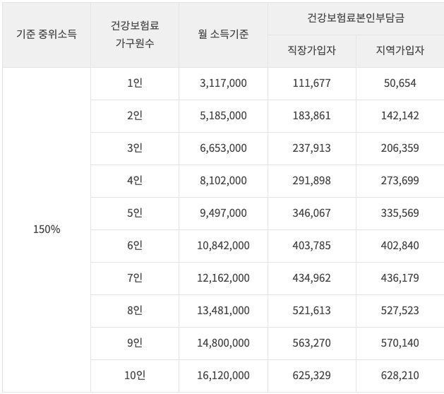 건강보험료 기준 중위 소득 150%의 월소득 기준은 가구 구성원 수에 따라 다릅니다. 아래 표를 보면 가구 구성원에 따른 월 소득이 어느 정도어야 150%에 드는지 확인할 수 있습니다