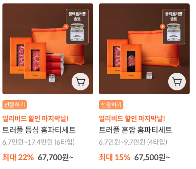 숙성한우 선물세트에 트러플 등심& 혼합 홈파티세트까지 구매하시면 특별 감사 카드에 각인 서비스까지 받을 수 있습니다. 끝으로 가정의 달 특별 구성 상품 10% 할인 혜택도 진행중입니다. 사토브리앙, 꽃등심, 채끝에 한우 치즈 버거 키트가 묶인 구성으로 성장기 아이들이 있는 가정에서 함께 즐길 수 있는 구성이라고 할 수 있습니다.