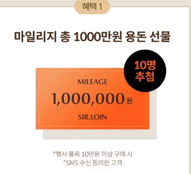 우선 대표적인 이벤트로 마일리지 1000만원 용돈 추첨이 있습니다. 행사 기간에 행사 품목 10만원 이상 구매 고객을 대상으로 10명을 추첨하여 설로인 제품 구매에 사용하실 수 있는 마일리지를 1000만원 주는 이벤트입니다. 한우 선물세트도 구매하고 행운도 기대해볼 수 있습니다.