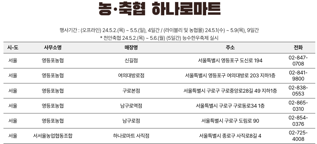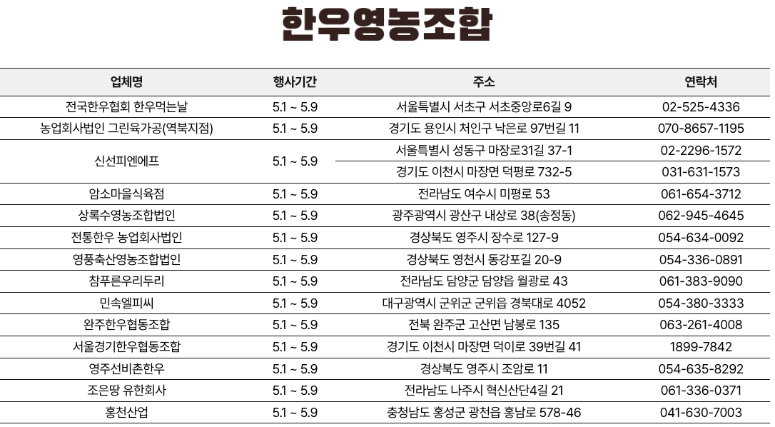 또 전국 한우영농조합에서 운영하는 오프라인 매장에서도 5월 1일부터 9일까지 할인된 가격으로 구매하실 수 있습니다.
