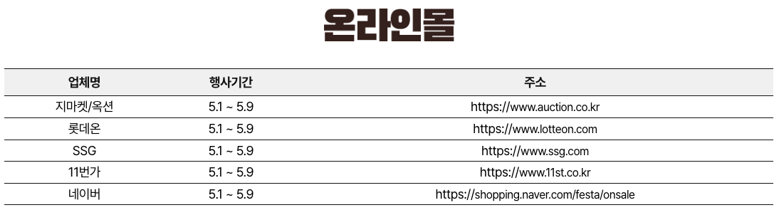 단, 각 오프라인 매장이나 온라인 쇼핑몰별로 행사 기간에 차이가 있으니 방문 전에 확인하시고 가셔야겠습니다.