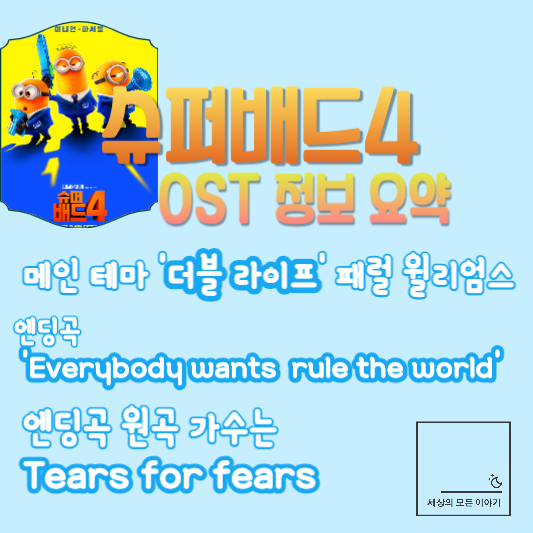 올 여름 극장가에서 흥행을 이어가고 있는 에니매이션 '슈퍼 배드4' 아시지요? 이미 관람하신 분들은 경쾌한 OST가 귓가에 멤도실 텐데요 이번 포스팅에서는 그런 분들을 위해 슈퍼 배드4 OST 정보와 메인 테마 가사 및 해석 까지 알려 드리겠습니다.