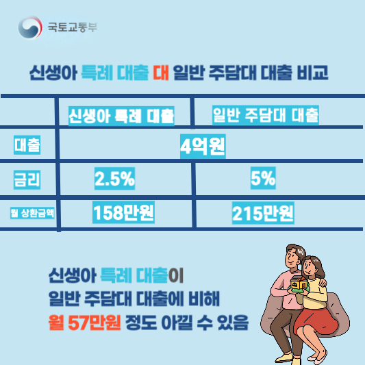 예를 들어 같은 4억을 주택 구입 자금으로 빌렸을 때 시중은행에서는 최소 5% 금리 적용하여 월 상환금액이 215만원인데 신생아 특례대출은 2.5% 금리 적용받았다고 해도 월 158만원만 상환해도 되니 매월 57만원 정도 아끼는 셈입니다. 대출 후 자녀를 더 출산하게되면 1명당 0.2%의 추가 금리 인하에 금리 적용기간도 5년 더 연장해준다고 합니다.