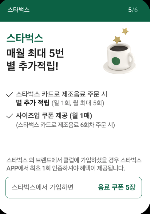 매월 최대 5번 별 추가 적립에, 사이즈업 쿠폰도 매월 한 장씩 사용하실 수 있습니다.