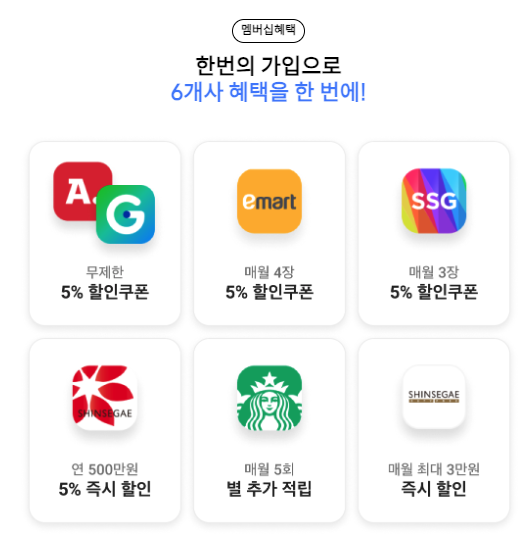 한번의 가입으로 여섯 개 계열사의 혜택을 한 번에 누릴 수 있다고 합니다.