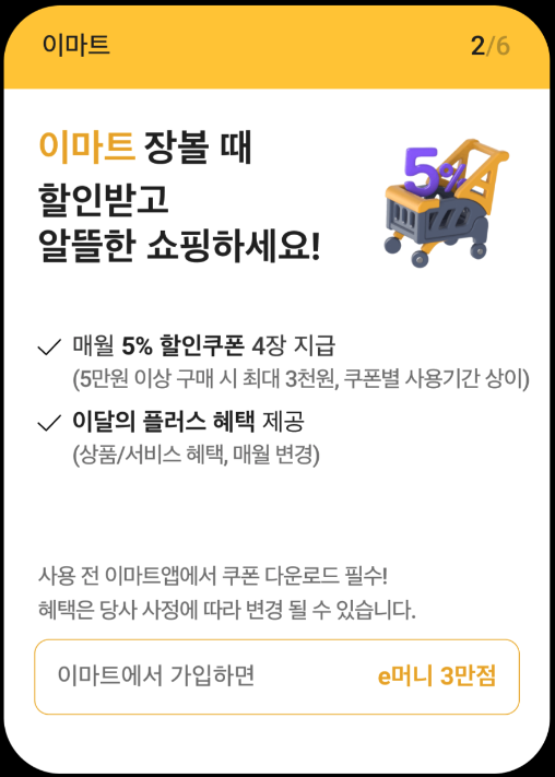 우선 이마트에서는 매월 5% 할인 쿠폰 4장이 지급(5만원 이상 구매 시 최대 3천원 할인)