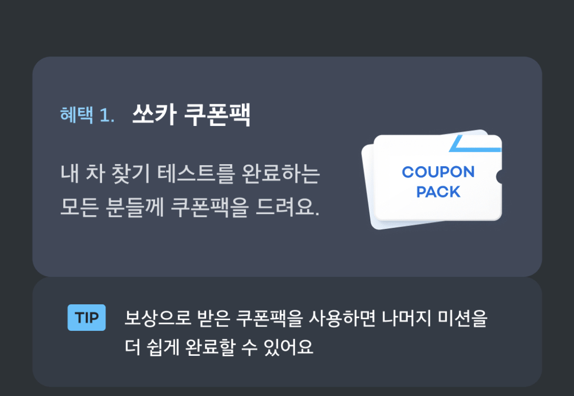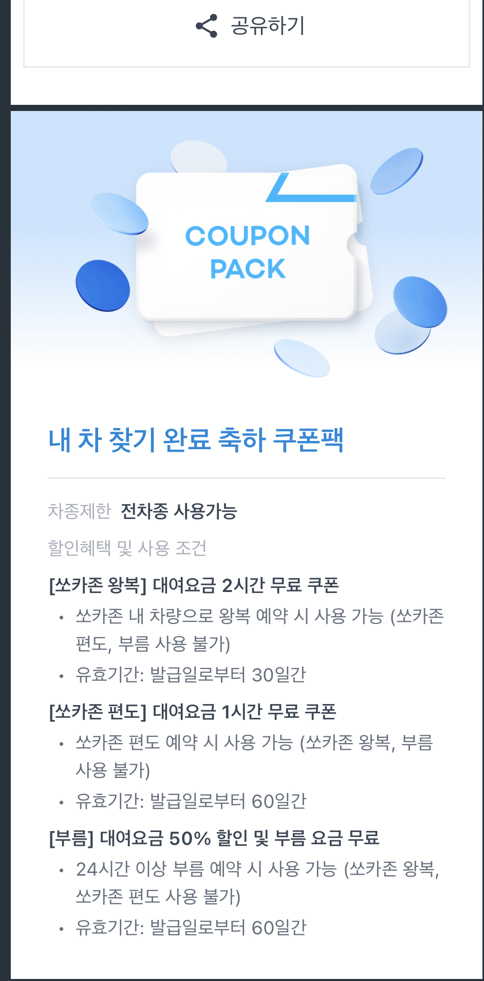 내 차 찾기 미션을 통과하면 위와 같은 쿠폰을 받을 수 있습니다 쿠폰의 내용을 보니 남은 네 가지 미션 참여에 도움이 되는 쿠폰들입니다. 쏘카 자주 이용하시는 분들은 참여 하셔서 혜택 누리시기 바랍니다.