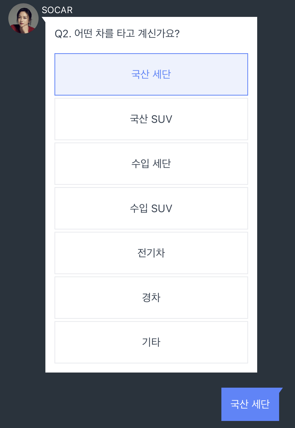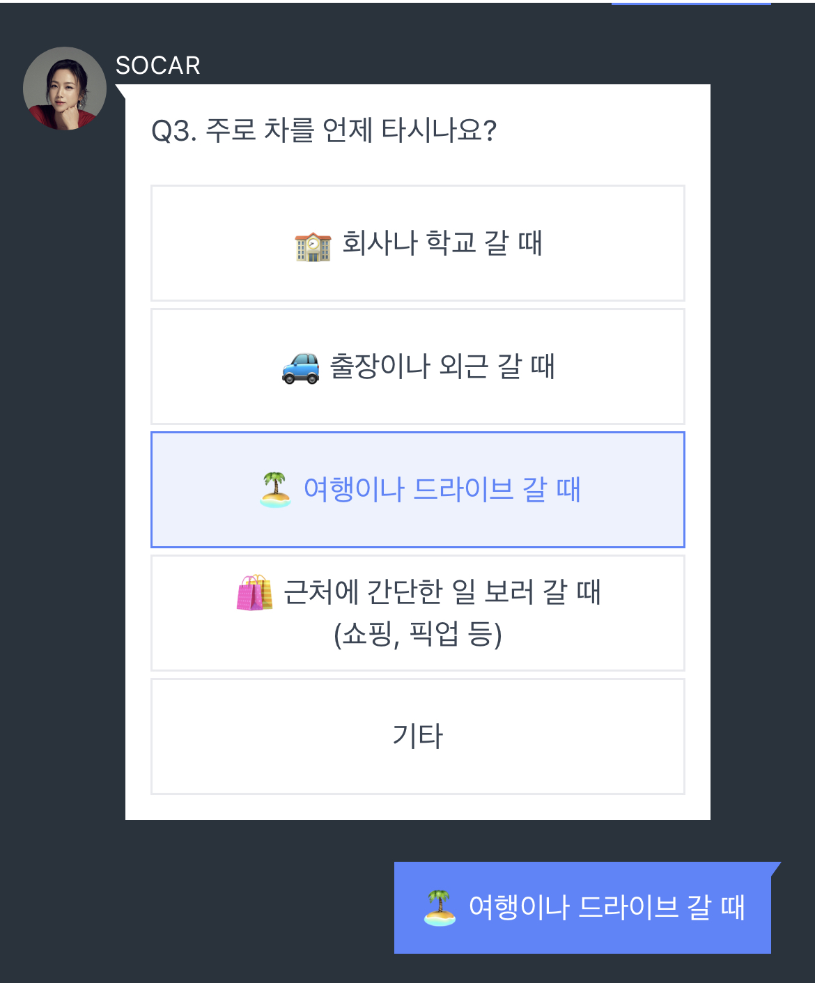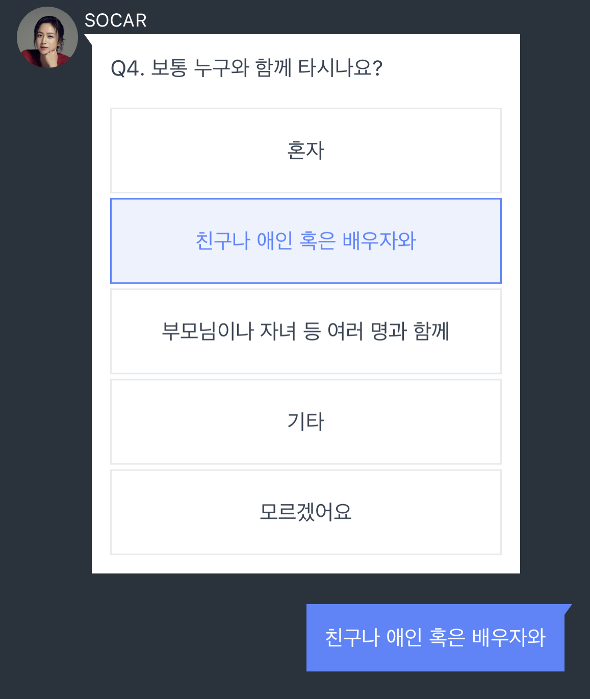 탕웨이님이 채팅으로 하는 다섯 개 질문에 답하면 첫 번째 미션은 완료하게 됩니다. 객관식 다섯 문제로 답은 아주 간단합니다. 탕우에님에게는 거짓말을 할 수 없었던 저는 솔직하게 답을 했고 SUV 차량을 추천 받았습니다.