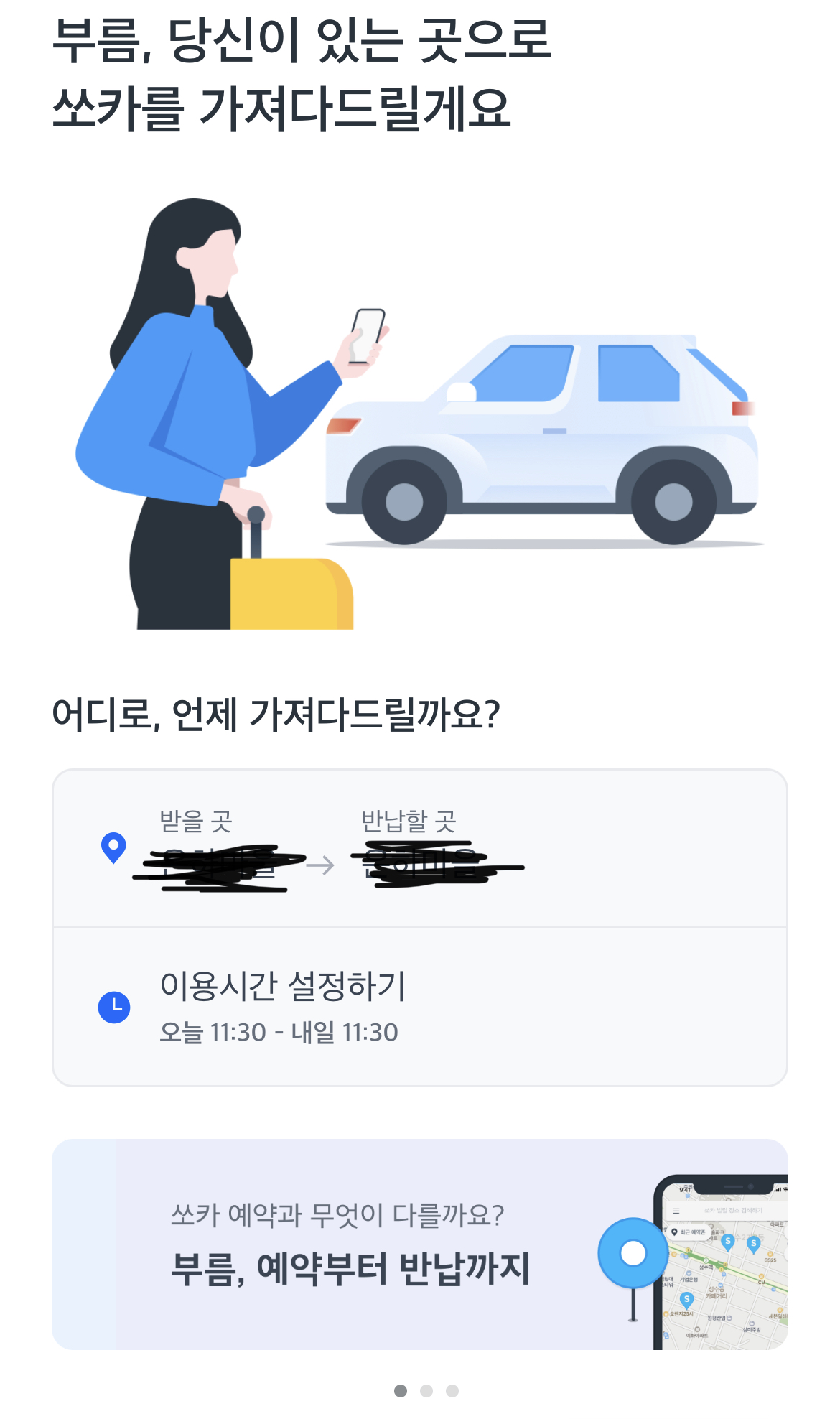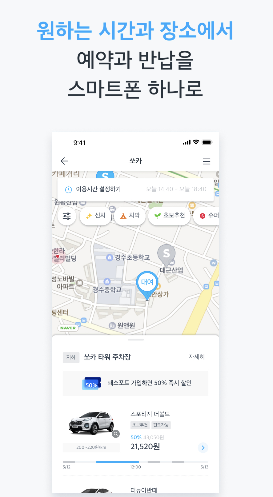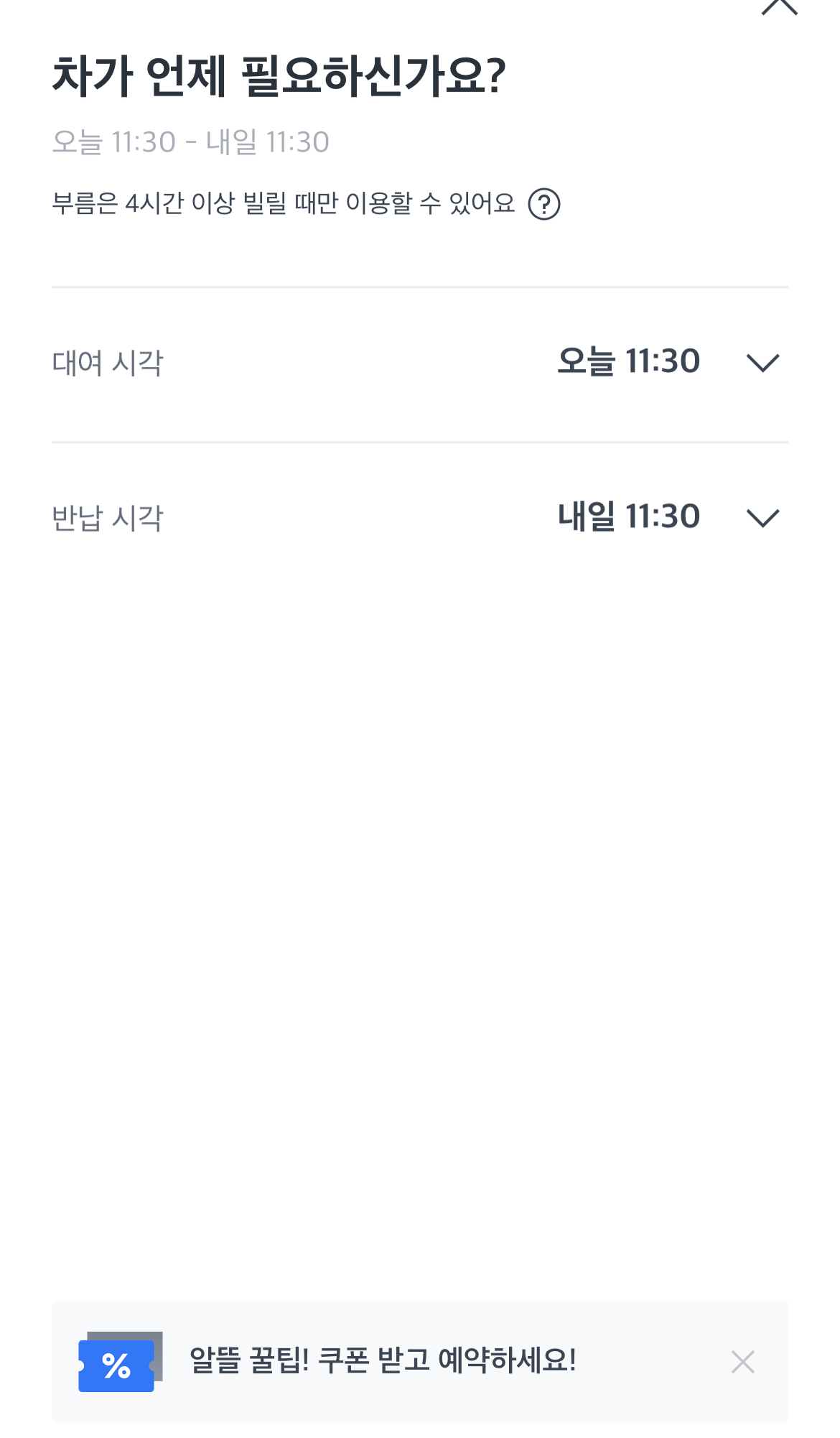 그럼 어플에서 차량이 필요한 요일이나 시간을 선택해줍니다. 가까운 쏘카존에서 예약하거나 내 집 앞으로 쏘카를 부를 수도 있습니다.