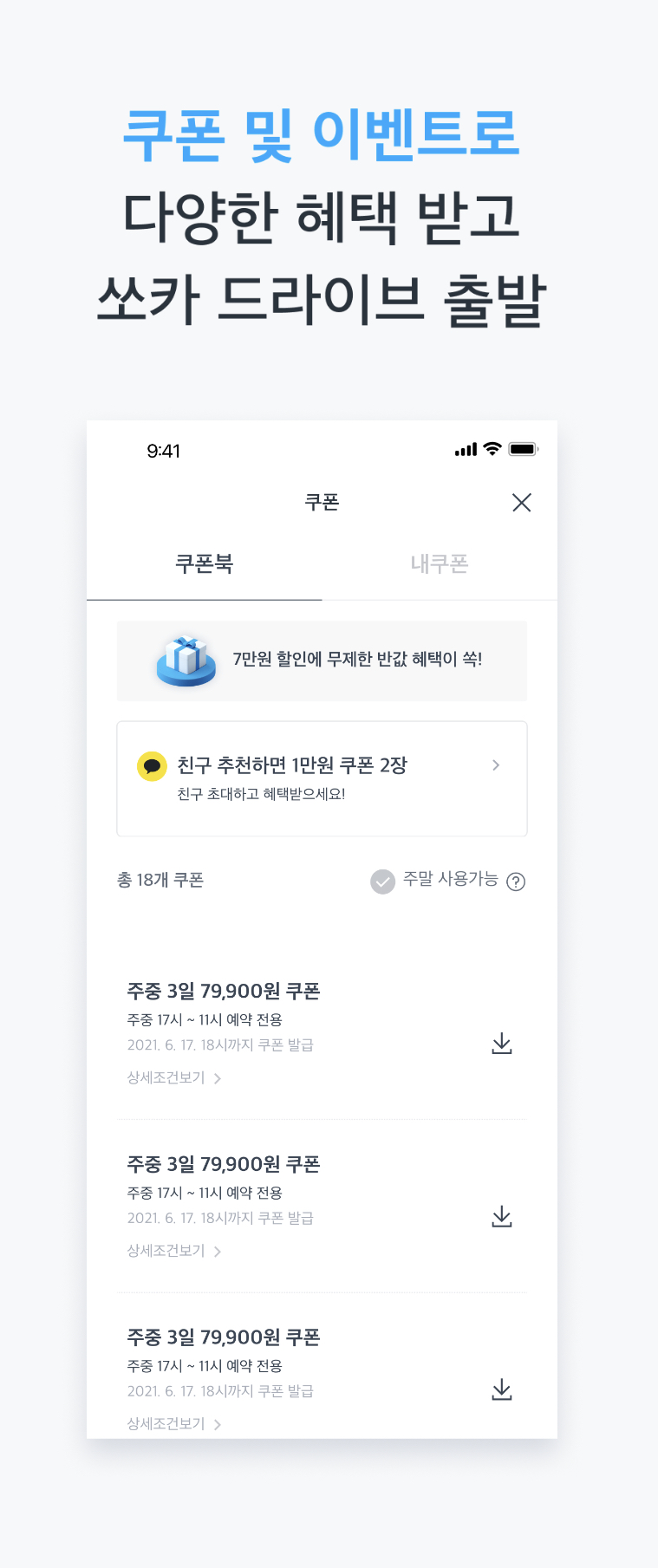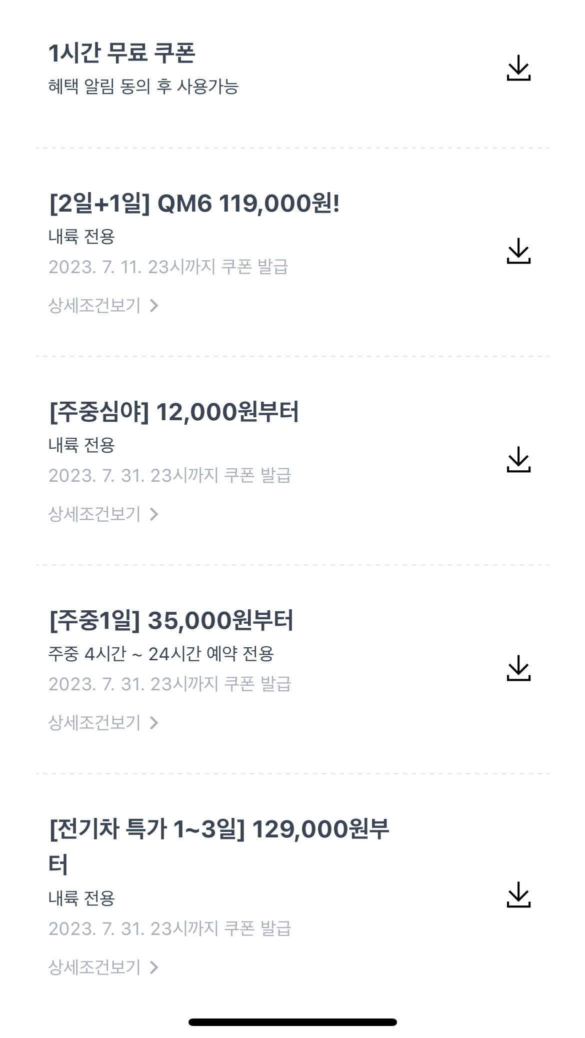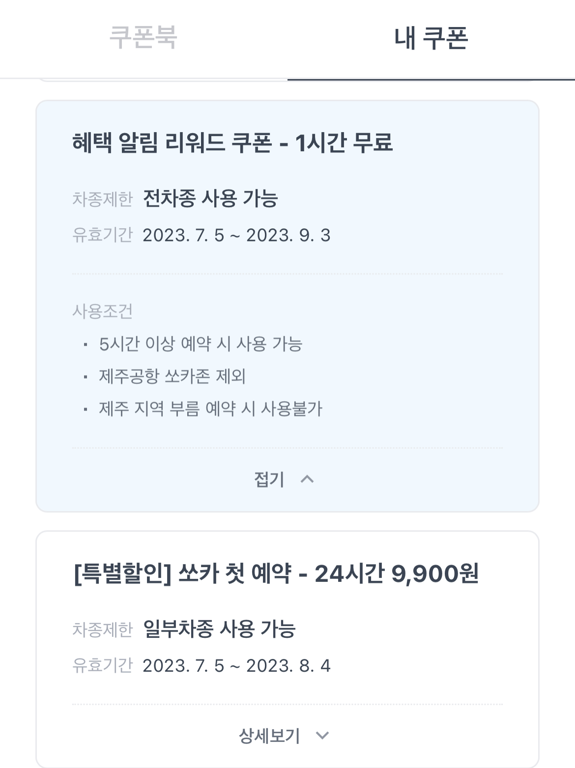 저는 첫 회원 가입 쿠폰으로 1시간 무료 쿠폰을 받았습니다. 전 차종 사용 가능하며 발급 받은 날부터 약 두 달 안에 사용해야합니다. 제주 제외하고 모든 지역 사용가능하며 최소  5시간 이상 사용할 때 그 중 한 시간 무료 혜택 받을 수 있는 쿠폰입니다. 그밖에도 시간 한정의 다양한 쿠폰들을 발급해주니 쏘카 사용 전에 어플에 적용 가능한 쿠폰이 있는지 내 쿠폰함을 꼭 확인하셔야겠습니다.