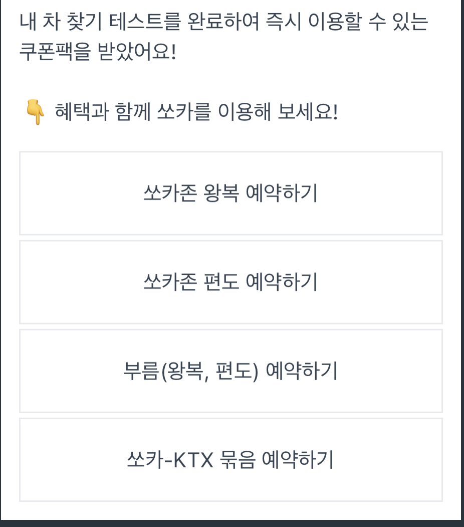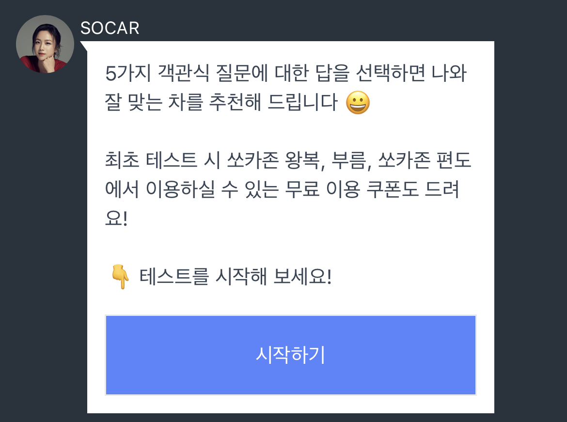 참여는 아주 간단합니다. 어플에서 해당 배너를 클릭하면 5가지 미션에 대한 안내가 나옵니다. 그중 제일 처음이 내 차 찾기 테스트입니다. 다섯 개의 질문을 보고 자신에게 맞다고 생각하는 답안을 고르면 그 결과 '내'게 어울리는 차를 찾아 주는 테스트입니다. 이 테스트를 완료하면 쏘카 쿠폰팩을 받을 수 있습니다.