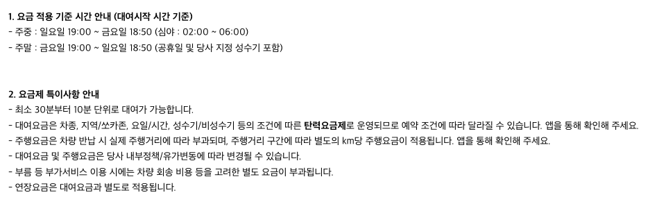 탑승 전 결제는 차량을 대여하는 요금에 선택하신 보험료까지 포함됩니다. 반납 시 결제주행거리에 Km 당 요금을 곱한 값을 결제합니다.(선택한 차량마다 다릅니다.) 거기에 하이패스 이용 요금까지 결제하게 됩니다.