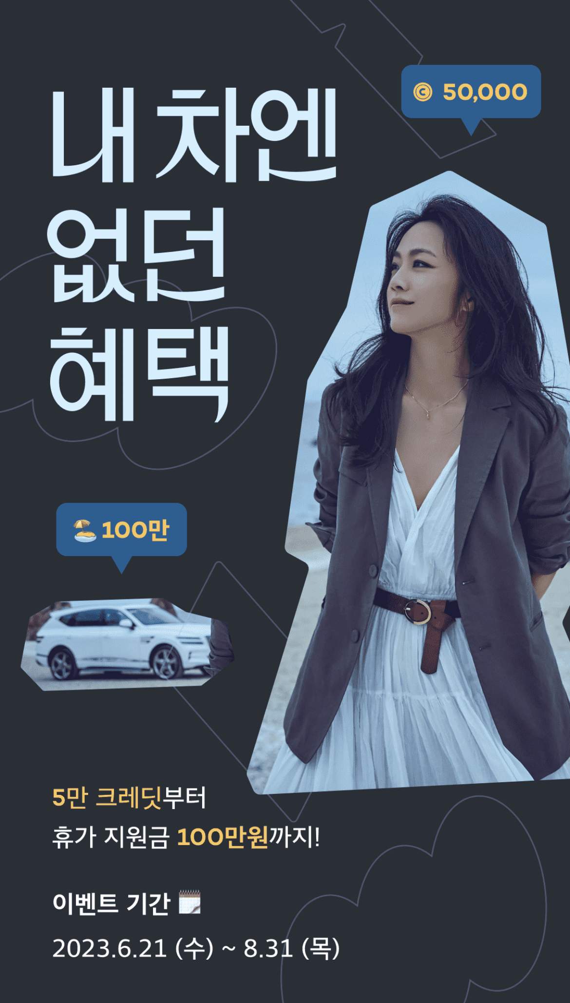 쏘카에서 참여형 이벤트도 진행중입니다. 최근에는 '내 차엔 없던 혜택'이라는 이벤트가 8월 31일가지 진행 중입니다. 5만 크레딧부터 휴가 지원금 100만원을 내세운 이벤트입니다.