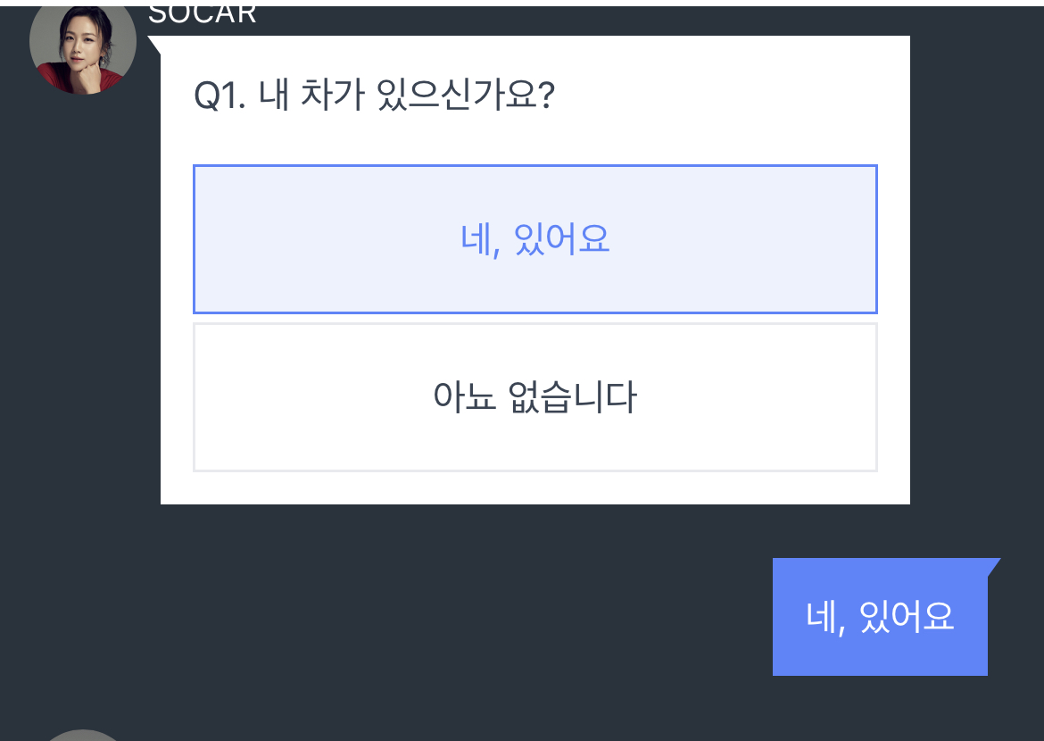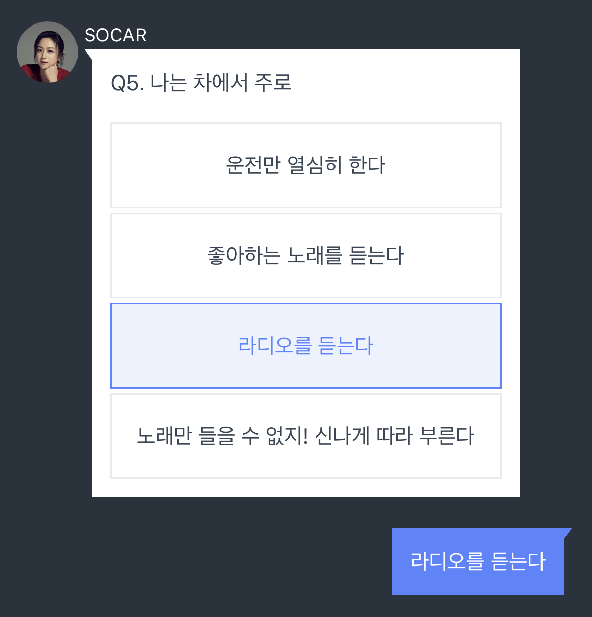 탕웨이님이 채팅으로 하는  다섯 개 질문에 답하면 첫 번째 미션은 완료하게 됩니다. 객관식 다섯 문제로 답은 아주 간단합니다. 탕우에님에게는 거짓말을 할 수 없었던 저는 솔직하게 답을 했고 SUV 차량을 추천 받았습니다.