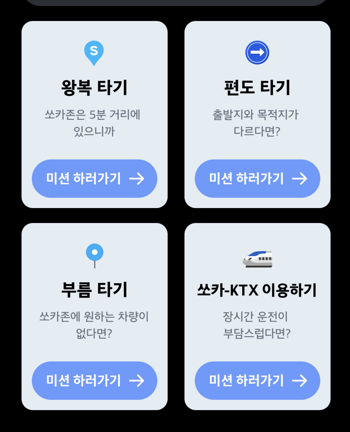 이렇게 첫 번째 미션을 완료하면 다음 네 가지 미션이 제시됩니다. 쏘카를 이용해 왕복 타기, 편도 타기, 부름 타기, 쏘카 KTX 이용하기 등 다양한 쏘카 이용 방법을 체험하게 하며 쏘카 사용을 장려합니다.