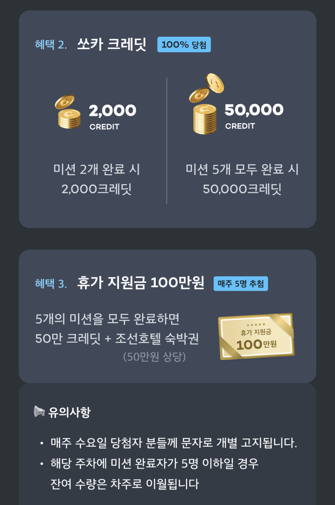 미션 두 개를 완료하면 2000 크레딧 미션 다섯 개를 완료하면 50,000크레딧을 받을 수 있습니다. 또 5개 미션을 모두 완료한 분들 중에 기간 내 매주 다섯 명씩 추첨하여 휴가 지원금 100만원(50만 크레딧 + 50만원 상당의 조선호텔 숙박권)을 주고 있습니다.
