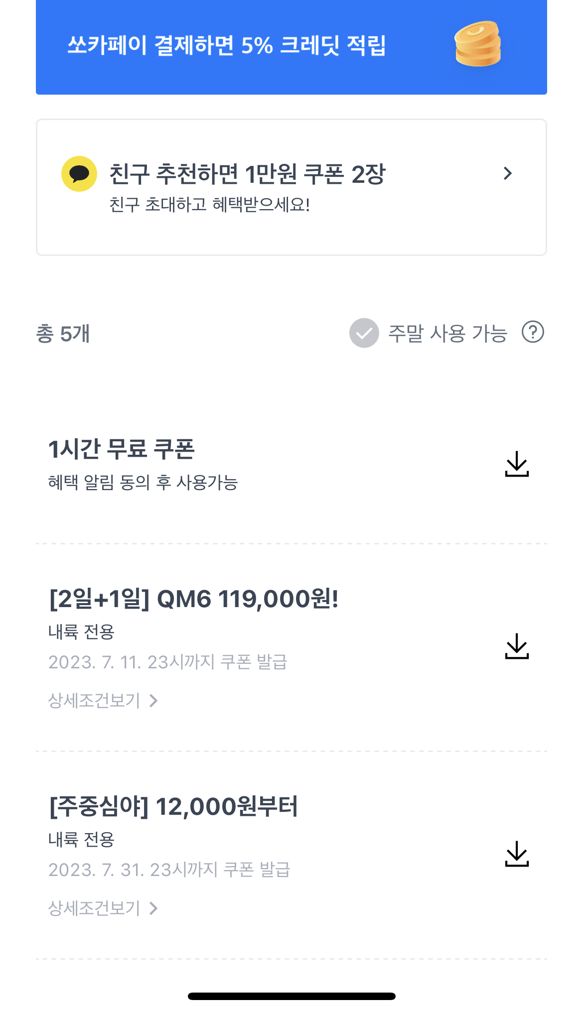 저는 첫 회원 가입 쿠폰으로 1시간 무료 쿠폰을 받았습니다. 전 차종 사용 가능하며 발급 받은 날부터 약 두 달 안에 사용해야합니다. 제주 제외하고 모든 지역 사용가능하며 최소 5시간 이상 사용할 때 그 중 한 시간 무료 혜택 받을 수 있는 쿠폰입니다. 그밖에도 시간 한정의 다양한 쿠폰들을 발급해주니 쏘카 사용 전에 어플에 적용 가능한 쿠폰이 있는지 내 쿠폰함을 꼭 확인하셔야겠습니다.