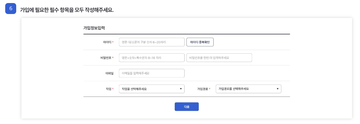 그 다음 끝으로 가입에 필요한 추가 정보(아이디, 비밀번호, 이메일, 직업, 가입경로) 등을 작성해주시면 가입이 완료됩니다.