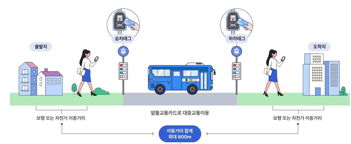 알뜰교통카드를 사용하여 대중교통을 이용하시면 출발지에서 승차점까지 이동거리, 하차점에서 도착지의 이동거리의 합으로 마일리지 적립할 수 있습니다. 이동 거리 합계가 최대 800M까지 적립에 반영됩니다.