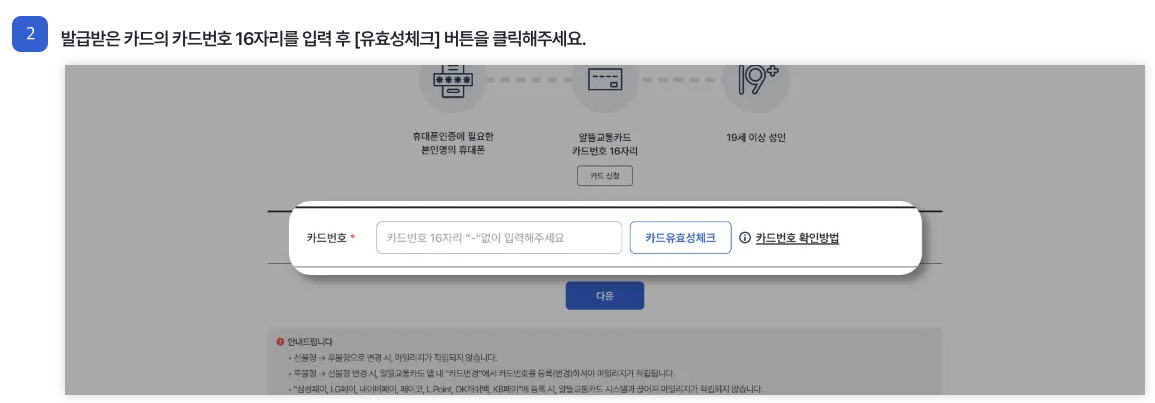 홈페이지에서 회원가입 버튼을 클릭 후 발급받은 카드번호 16자리를 입력 한 후 [유효성 체크] 버튼을 클릭하십니다.