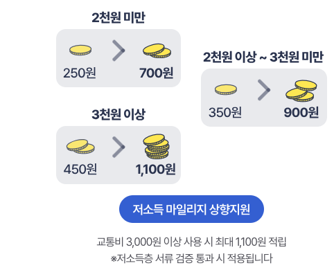 | 기본 마일리지 | 2천원 미만(이용 금액) | 2천원 ~ 3천원 | 3천원 이상 | 비고 |